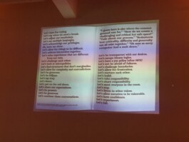 Der Raum bietet zum einen Zeiten für offenen und öffentlichen Dialog, zum anderen Austausch von persönlichen Erfahrungen als Safe Space. Das rahmende Programm — Vorträge, Filme, Vernetzungsworkshops und »futurologisch konspirative Gespräche« — bringen unterschiedliche Perspektiven zusammen und werden zur Diskussionsgrundlage, wie die feministische Auseinandersetzung mit Marginalisierungen an der Hochschule verstetigt werden kann.